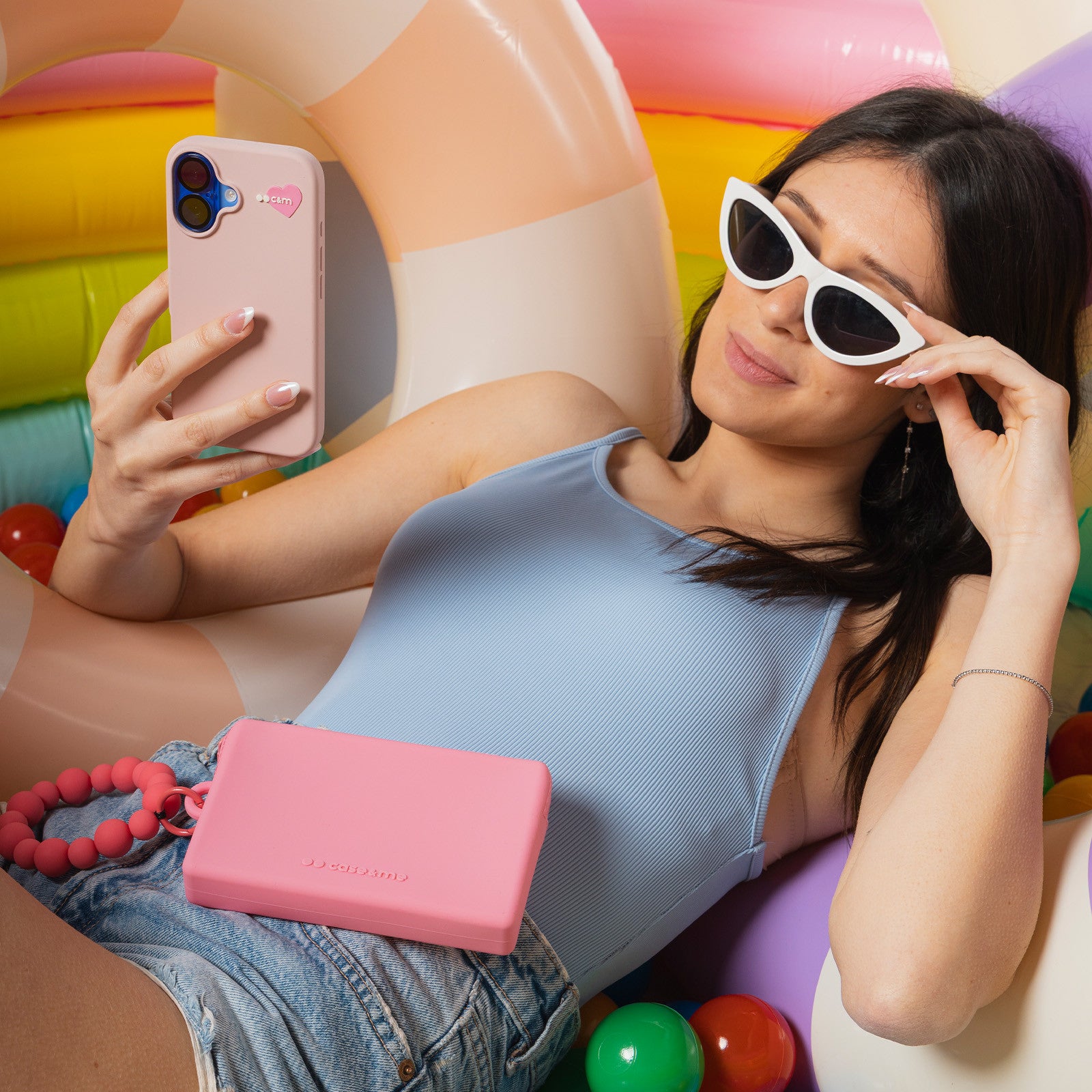 The Jelly Collection by case&me offers colourful, silicone wrist bags. These phone bags also have plenty of space for your make-up, keys and wallet. They are very practical to carry thanks to the integrated drawstring. Take them with you to the beach or swimming pool: they are waterproof and can withstand splashes of water or sand. The Jelly covers are dedicated to the iPhone 15, iPhone 15 Pro Max and iPhone 15 Pro. They are decorated with beautiful embossed flowers and are extremely soft to the touch. The iPhone rests on a microfibre interior that pampers the body of your Apple smartphone. Even the side buttons are protected: the Jelly iPhone case is the perfect everyday protection! Jelly Beads are super-soft, practically stress-free wrist phone holders! Hook them onto your smartphone case via the integrated loop and wear your mobile phone like a bracelet.